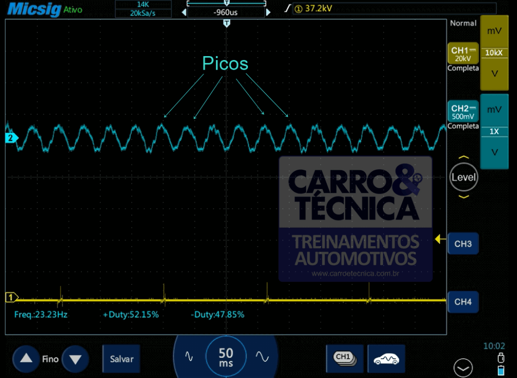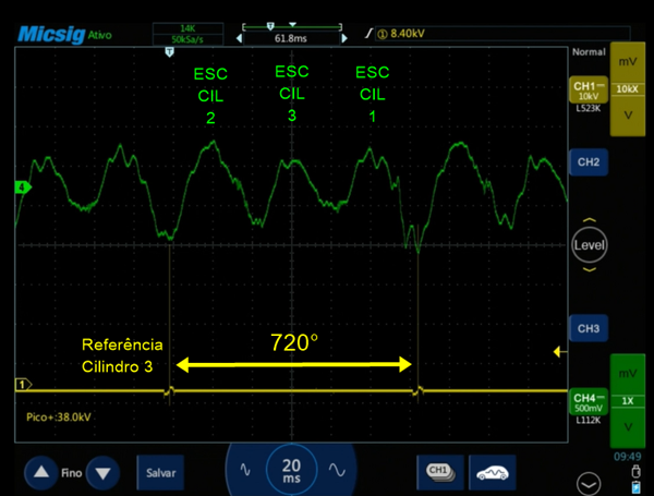Com a amostra desse sinal, associado a um sinal de ignição de um dos cilindros, podemos identificar com precisão e rapidez qual cilindro está falhando, recurso que se torna ainda mais útil nos casos em que temos falhas de combustão intermitentes.
