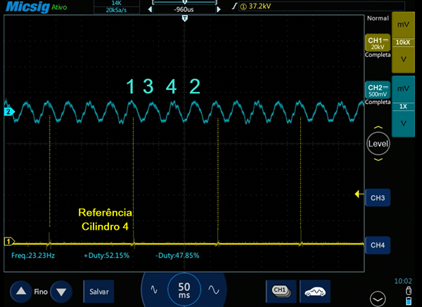 Na imagem abaixo podemos observar a ordem de exaustão dos cilindros, utilizando o sinal de ignição do cilindro 4 como referência, através do osciloscópio automotivo. Observe que o pulso de ignição do cilindro 4 fica alinhado com a pulso de exaustão do cilindro 1, característica dos motores com cilindros gêmeos.